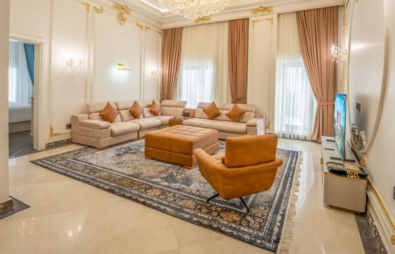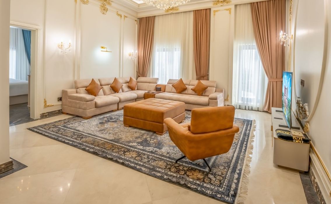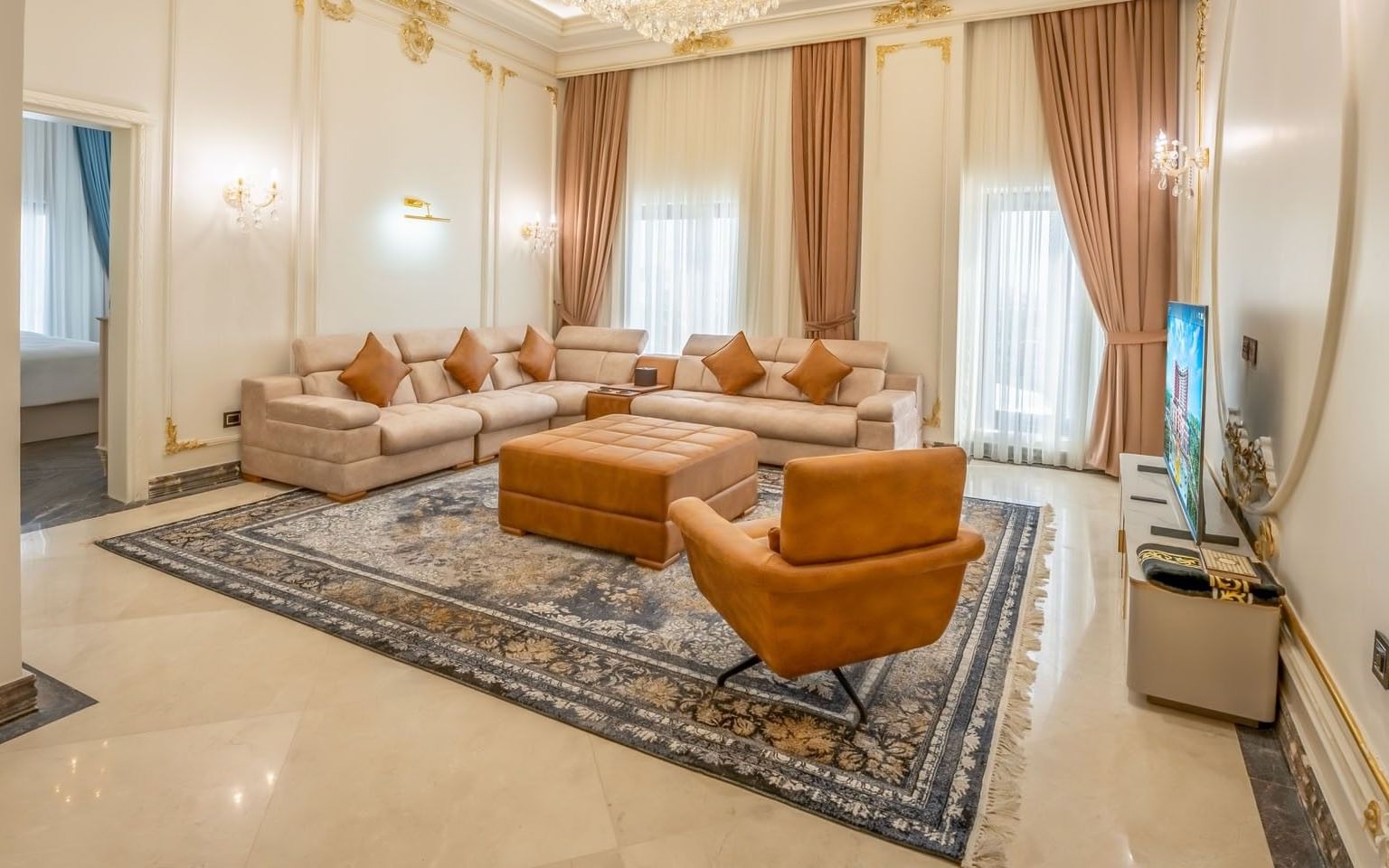 This neoclassicaly designed apartment features three refined bedrooms, a spacious living area, and a fully equipped modern kitchen.